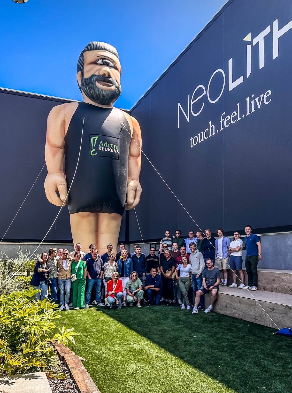In the year 2000 the Italian artist Marco Boggio Sella made a cyclop sculpture for the art project "Over The Edges", in the city of Ghent. Afterwards, the giant ended up in the warehouses of the SMAK museum, taking up valuable space, and blocking an emergency exit. After spending a little time in a florist garden, the sculpture was bought by a company dealing in heavy machinery. It spent multiple years along the E17 highway where it was a notorious landmark. When it was set on fire, the owner had it rebuilt. In 2022 the giant found its new family at Adrem kitchens, where he was named Medar